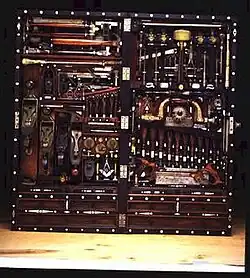 When closed and hanging on a wall it takes up an area of approximately 39 inches by 20 inches with a 9 inch depth.[2] It opens to become a 40-inch by 40-inch tool chest. It is made out of mahogany, rosewood, walnut, ebony, ivory and mother of pearl, materials that were probably taken from the Poole Piano Company's scrap material. The fine craftsmanship is exhibited by the way each tool fits snugly into its space, often with an audible click as the tool snaps into its close-fit cavity. Sections of the chest swing out to allow access to a second or third layer of tools. The tool chest features Masonic symbolism, including the Square and Compasses emblem and Royal Arch symbols.