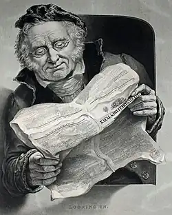 Sales of mezzotint prints of Parker's work became increasing important to his finances, and in 1833, Danger was his first painting to be purchased by Ackermann's of London for reproduction and publishing. Ackermann's print shop in Regent Street, London, was advertised as having "the largest collection of exhibition prints and of London always on view: from 1s. to 21s. plain and coloured". As publishers, Ackermann's were leaders in the field of selling multi-coloured lithographic images.'[36] Perhaps through the influence of Ackermann's, Parker would start to appreciate the importance of a good title – Looking Out (‘a resolute smuggler, leaning out of a porthole’) and Looking In (‘a weather-beaten sailor, in a similar position, reading the Naval Gazette) would become two of his best-known Ackermann prints.[37] The Banquet Given on the Occasion of the Opening of the Grainger Market, Newcastle upon Tyne, 1835 was another large commemorative picture containing many portraits of local dignitaries, such as John Dobson, Richard Grainger, John Clayton (the town clerk) and John L. Hood (the mayor).
