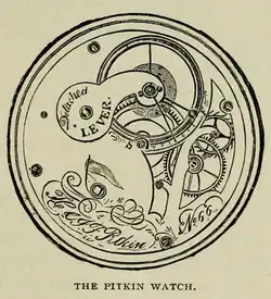 Mass production of Pitkin watches began in 1836. Pitkin with his brother designed the first American pocket watches containing the first American machine-made parts.[2][4] The Pitkin Watch Company was the first to mass-produce pocket watches in America.[5] Pitkin's pocket watches had an excellent reputation for being accurate and durable.[4] The plates for the Pitkins pocket watches were punched out with stamping dies but many times had to be finished to close tolerances by hand. The movements were three-quarter plate, slow train, and about the diameter of the modern 16-size pocket watch.[1] The watchcases they made themselves from gold and silver. They imported from Europe many of the dials, hands, hairsprings and balance jewels needed for their watches, even though they tried to avoid using foreign-made parts. Pitkin named the first fifty movements after himself, however after that the name H & J. F. Pitkin was used. They did not engrave the place of their production shop on their watches, however the words Detached Lever were put on the balance bridge.[6] Pitkin and his brother made about 800 watches between 1836 and 1841.[7]