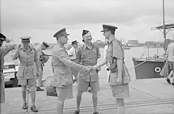 Pownall became commander-in-chief of the British Far East Command in South East Asia from December 1941 until 1942, which did not achieve anything of note when it was succeeded by the short-lived ABDACOM, and he became chief of staff to General Sir Archibald Wavell.[12] His rank of lieutenant-general became substantive on 17 January 1942.[28] For this service, he was mentioned in despatches once more,[29] and he was made a Grand Officer of the Order of Orange-Nassau by Queen Wilhelmina of the Netherlands.[30]