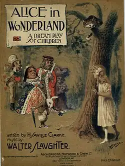 Clarke wrote the book and lyrics for the successful musical Alice in Wonderland[10] with music by Walter Slaughter and additional lyrics by Aubrey Hopwood. It opened as "A musical dream play in two acts" on 23 December 1886 at the Prince of Wales Theatre, London, where it gained popularity, with Phoebe Carlo in the title role. Carroll was fully involved, offering advice on everything from adaptation to choosing the cast. The musical had twelve West End revivals between 1888 and 1934.[11] In 1890 Clarke was called on to adapt Thackeray's The Rose and the Ring which again was set to music by Walter Slaughter.[5]