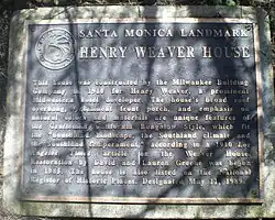 Henry Weaver House, a California Bungalow, is in Santa Monica, California. It was built in 1910 by the Milwaukee Building Company for Henry Weaver, a Midwestern hotel developer. The house's broad roof overhang, prominent front porch and emphasis on natural colors and materials are unique features of the American Craftsman California Bungalow Style, which "fit the Southland landscape, Southland climate and Southland temperament," according to a 1910 Los Angeles Times article on the Weaver house.