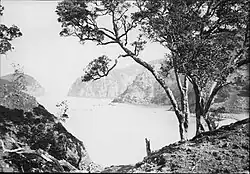 Winkelmann supplemented his income by teaching the zither and performing in concerts;[1] with Mrs. Buckland of Highwic being among his clients.[11] Winkelmann also began making money from photography, after purchasing a Lancaster Instantograph camera in April 1892. He likely set up a darkroom in his mother's house called Claremont at 14 Dock Street (now Huia Street), Devonport, where the family moved to in 1892.[11] In 1895, Winkelmann won a second prize in the New Zealand Graphic photographic competition,[1] for a photograph Winkelmann took of Rosalie Bay.[12] His interests in yachting began in 1893 after meeting the Horton brothers, who owned the yacht Tawera. Winkelmann would accompany the family on their cruises, and began taking photographs of watercraft during this period.[9]