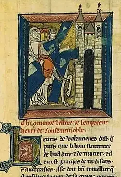 Henry of Valenciennes was a chronicler under Henry of Flanders who left for the Fourth Crusade with the army of his patron. In 1204, following the capture of Constantinople by the Franco-Venetian forces, he became a canon in the Hagia Sophia. In 1206, the year of his patron's accession to the throne of the Latin Empire, he was tasked with compiling a chronicle mostly focused on his deeds, roughly picking up where Geoffrey of Villehardouin's chronicle concludes. As a result, Henry's chronicle is usually included with Geoffrey's in the surviving manuscripts. It abruptly ends in 1209 or 1210,[1] but it is notable for its account of the battle of Philippopolis.[2] Henry is also credited with the Lai d'Aristote, previously attributed to the Norman Henry d'Andeli.[3][4]