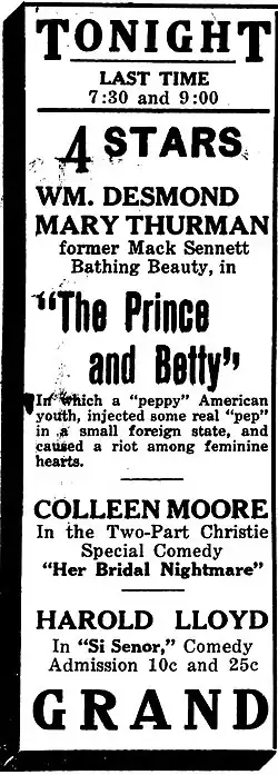 ![]() Contemporary newspaper advertisement for three films including Her Bridal Nightmare | |