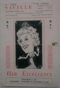 Her Excellency is a musical comedy composed by Manning Sherwin and Harold Purcell from a book by Archie Menzies and Max Kester. A couple of the songs were composed by Harry Parr-Davies. The story takes place entirely in the British Embassy in the fictional San Barcellos.