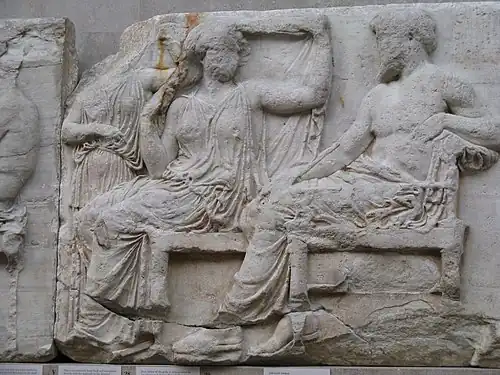 Hera exists as a spouse of Zeus and their "sacred marriage" was celebrated in many Greek festivals in a processional ceremony from ancient times.[1] The myth of the premarital approach of Hera by Zeus is early mentioned by Homer .[58] It is possible that the myth has its origins to an old custom of the European country population, the premarital intercourse of the engaged couple.[59] According to Walter Burkert the "Mediterranean goddess of nature" becomes the bride of the Greek sky-god.[60] He notices that "the disappearance and retrieval of Hera has parallels with other fertility cults" .[61][62] Hera was originally a goddess of fertility in her fest "Toneia" at Samos and at Knossos in Crete. At Samos the image of Hera was hidden bounted in willows and the participants tried to discover it.[63][64] At Knossos Zeus is mating with the earth goddess (finally named Hera) in a very ancient ritual.[1] In her festival Daedala at Plataia there is an account of Hera's quarrel with Zeus and their reconciliation.[65][17]