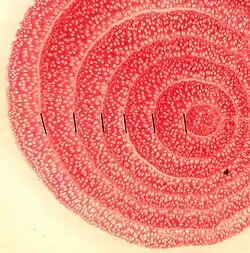 Counting of annual growth rings can be used to determine the age of a perennial herb similarly as it is done in trees using dendrochronology.[2] This way it was found that some perennial herbs live up to 50 years and more.[3][4]