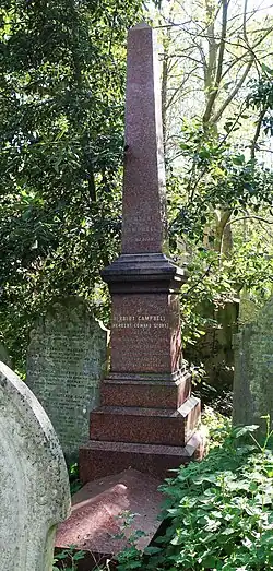 Campbell died on 19 July 1904 from a brain haemorrhage after he was injured by a horse having alighted from his brougham.[13][14] He was buried at Abney Park Cemetery, Stoke Newington, three days later.[2]