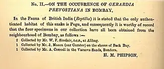 Phipson was visiting England when the Bombay Natural History Society was founded on 15 September 1883. Upon his return to Bombay, he immediately joined BNHS and in January 1884 offered office space belonging to his business as a permanent home for the Society. Two years later, when the need was felt for BNHS to expand, he again offered the Society part of the larger premises he had acquired for his business at 6 Apollo Street, Bombay. This was to be BNHS's home for the next fifty years.[1] From March 1886, when he succeeded E. H. Aitken as honorary secretary, to April 1906 when he returned to England, Phipson was the driving force behind the Society. He served as the editor of the Journal of the Bombay Natural History Society for twenty years – as the sole editor for fifteen years and then joint editor with W. S. Millard who succeeded him as honorary secretary. His main area of scholarly interest was snakes and, in spite of being tied down by his business and BNHS work, he found time to write the occasional note.[3]