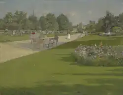 In June 1857, the Common Council of the City of Brooklyn voted to establish Tompkins Park, making it the first park established by the city of Brooklyn.[9] Funding was achieved six months later, as the incorporation papers were misplaced and had to be relocated.[10] In 1870, the Parks Commission took control of the park, and in 1871, James Stranahan commissioned Calvert Vaux and Frederick Law Olmsted – architects for Central and Prospect parks – to submit a plan for the park.[8][10] The land was originally named Tompkins Park, after former New York governor Daniel D. Tompkins.[7] The original design was highly symmetrical and did not include any trees or paths, believing they would be used "for clandestine purposes by people of bad character." In the 1870s and 1880s, the park was used for military review as well as public leisure; in 1875, the Tompkins Park Croquet Club was formed.[10][11] In 1878, a shelter and veranda meant for women and children was constructed.[12][10] In 1899, the Tompkins Park Library, located in the center of the park, opened under Public Library Association, and in 1901, it became a part of the Brooklyn Public Library system.[13][14] Artist William Merritt Chase, a resident of Bedford-Stuyvesant, was a frequent visitor of the park and painted it at least five times in the 1880s, creating some of the earliest color representations of the neighborhood.[15] The park also underwent improvements in the 1910s, with a concert space being constructed in 1915.[16][8] In 1916, the library and women's shelter were also renovated and combined.[17]