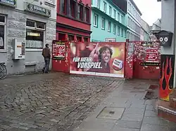 At the time of Nazi Germany, there was a ban on striptease and prostitution from 1933.[2][4] However, as a ban on the typical St. Pauli trade could not be consistently enforced,[4] these activities were tolerated only in an alley—Herbertstrasse.[2][3][4][7] In order that no one could see in advance what was really not to be allowed, barriers were erected at both ends of the street.[3][7]