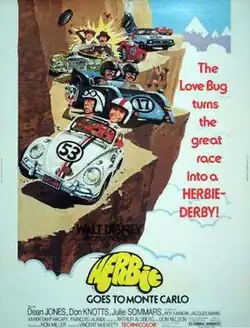 Herbie Goes to Monte Carlo is a 1977 American sports adventure comedy film directed by Vincent McEveety and written by Arthur Alsberg and Don Nelson.[2][3] The film is the third installment in the Herbie film series and the sequel to Herbie Rides Again (1974). In the film, Dean Jones returns as champion race car driver Jim Douglas (reprising his role from The Love Bug, the first film in the series), joined this time by his somewhat cynical and eccentric riding mechanic Wheely Applegate (Don Knotts). The film follows Douglas, Herbie and Applegate as they participate in the fictional Trans-France Race, a road race from Paris, France, to Monte Carlo, Monaco.