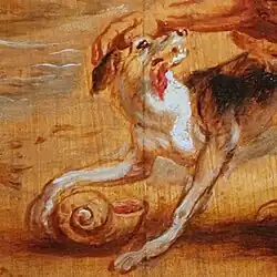 Rubens's painting of this story depicts Hercules and the dog on the beach, with the dog's mouth stained.[3][4][5] Although the snail in the story should be a spiny murex, the kind of snail from which Tyrian purple was made, Rubens instead depicts a large smooth shell that resembles a nautilus.[6]