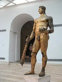 The temple of the Forum Boarium in Rome is located by the Tiber River. The statue was first created for the cult of Ara Maxima, which was dedicated to Hercules by the Greek king Evander. Legend states that the statue was created to commemorate the story of Hercules killing the robber Cacus, who attempted to steal the cattle of Geryon. During the early Renaissance, the little that was left of the temple was demolished under the orders of Sixtus IV. The temple was converted into a church.[4] This statue of Hercules was moved to the Palazzo dei Conservatori on the Campidoglio in 1510[5] The statue of Hercules Aemilianus is believed to have been commissioned by either Aemilius Paullus, who dedicated a tomb to Hercules, or by Scipio Aemilianus.[2] The statue was found after Romans demolished a portion to create space for their new rotunda.[6] There are two ancient temples where the statue may have been displayed: the temple located between Circus Maximus and the Church of Santa Maria and the temple of Hercules Ameliana. The statue of Hercules of the Theatre of Pompey, also known as the statue of Hercules Invictus, was discovered in 1864 near the Theatre of Pompey, and is known as the Hercules Mastai or Mastai Righetti. This is the gilded, bronze statue of Hercules that is now located in the Vatican Rotunda and is currently (2023) being restored.[7]