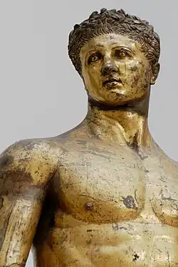 The bronze sculpture is slightly over life-sized[1] and is in the Hellenistic style of the second century BC. The Hellenistic style was based on the canon of proportions that had been established by Lysippos in the early fourth century BC. The muscles on the sculpture are exaggerated and the head is proportionally smaller when compared to the rest of the body. The Forum Boarium statue is one of the two surviving full-sized Greek statues from ancient Greece. The second Hercules statue was discovered near the Theatre of Pompey and is now in the Vatican Museums. The Hercules of the Theatre of Pompey had been carefully buried under protective tiles and incised FCS (Fulgor Conditum Summanium) because it was constantly hit by lightning.[2] The Hercules of the Theatre of Pompey depicts him leaning on his club vertically as he holds the apple of Hesperides in his left hand. On his left forearm, he has draped the skin of the Nemean Lion that he defeated on his first Labor.[2] Both sculptures display contrapposto, a typical style from Lysippos in which the figure's weight is thrown entirely on one foot. Though their muscles are exaggerated, they stand in marked contrast to the bearded, burly and perhaps more familiar Farnese Hercules.