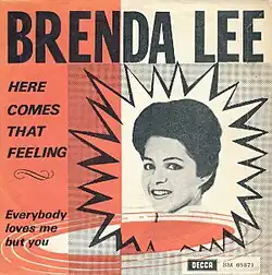 "Here Comes That Feeling" is a song written by Dorsey Burnette and Joe Osborn. It is best known as a hit for Brenda Lee.[1] In 1962, the song reached No.5 in the UK, No. 40 in Australia, and No.89 on the Billboard Hot 100.[2] In 2000, a recording of it by The Cockroaches was used in the soundtrack of the film The Crossing.