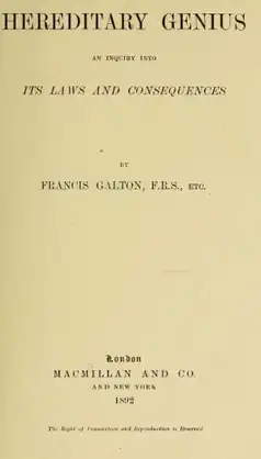 Hereditary Genius: An Inquiry Into Its Laws and Consequences is a book by Francis Galton about the genetic inheritance of intelligence. It was first published in 1869 by Macmillan Publishers.[1] The first American edition was published by D. Appleton & Company in 1870.[2] It was Galton's first major work written from a hereditarian perspective.[3] It was later referred to as "the first serious study of the inheritance of intelligence"[4] and as "the beginning of scientific interest in the topic of genius."[5]