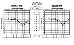 Alport syndrome can also cause hearing loss although some patients are not affected.[11] Hearing in Alport syndrome patients is normal at birth. Hearing loss in affected patients develops progressively, usually at the stage when kidney function is normal, but there is substantial proteinuria. However, in some patients, hearing loss is only noted after kidney function has been lost. Characteristically the early changes are reduced ability to hear high-frequency sounds, sensorineural deafness. This becomes more severe and affects lower frequencies too. Hearing loss is not usually complete in Alport syndrome; good communication is almost always possible with the use of hearing aids.[12]