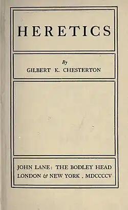 Heretics is a collection of 20 essays by English writer G. K. Chesterton published by John Lane in 1905.[1] In it, Chesterton quotes at length and argues extensively against atheist Joseph McCabe and delivers diatribes about his close personal friend and intellectual rival George Bernard Shaw, as well as about Friedrich Nietzsche, H. G. Wells, Rudyard Kipling, and an array of other major intellectuals of his day, many of whom he knew personally. His topics range from cosmology to anthropology to soteriology, and he argues against French nihilism, German humanism, English utilitarianism, the syncretism of "the vague modern", Social Darwinism, eugenics, and the arrogance and misanthropy of the European intelligentsia. Together with Orthodoxy (1908), this book is regarded as central to Chesterton's corpus of moral theology.