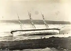 On 5 May a storm forced her aground at the north end of Maroubra Beach, Sydney.[6] All 25 crew members safely got ashore, where they reached a nearby wool scouring works.[7][8][9][10]