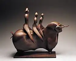 Common elements in his work include pigeons, the human figure, horses and especially bulls. Despite the short list, none of these depictions repeat. All are distinct. He has particularly depicted bulls in a wide variety of sizes, shapes, textures and colors. Pigeons come in second place which he generally depicts in simple lines in materials such as bronze, marble and onyx .[1] He advocated that Mexican art should reflect Mexican thought and life.[3]