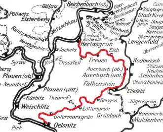 The Herlasgrün–Oelsnitz railway is a branch line in the German states of Saxony, which was originally built as a section of the Voigtland State Railway from Herlasgrüner to Cheb. It starts at the junction station of Herlasgrüner on the Leipzig–Hof railway and runs via Auerbach to Falkenstein. The southern part of the line from Falkenstein via Bergen to Oelsnitz was closed in 1951.
