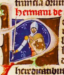 Medieval Hungarian chronicles preserved its origin from the Duchy of Bavaria. Accordingly, the ancestor of the Hermán kindred, knight Herman originated from Nuremberg, who escorted Gisela of Bavaria to Hungary in 996. She became the wife of Stephen I of Hungary, the future first King of Hungary. Following that marriage, Herman stayed in Hungary and received land donations in Vas County.[3] It is presumable that Herman also participated in Stephen's civil war against his relative Koppány in the following year, similarly to other German knights, for instance Vecelin and brothers Hont and Pázmány, ancestors of the Hont-Pázmány kindred.