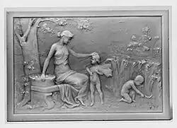 The Westward Journey, one of Muellers earlier works, is a collection of limestone sculptures that form part of the Indiana Statehouse.