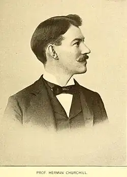 Churchill began his academic career as an instructor of English literature at Northwestern University in Evanston, Illinois, in 1903. In the fall of 1907, he accepted a position as head of the English Department at Southwestern College in Winfield, Kansas, until 1909 when he accepted a similar position at Nebraska Wesleyan University in Lincoln, Nebraska. In 1912, Churchill made his final move in accepting the position as head of the Department of Rhetoric and Composition at Rhode Island State College.[1] Afterward in 1921, Churchill was appointed as the founding head of the History Department by the college president, Howard Edwards.[3] During his professional career, Churchill was active in civic affairs in the community, serving as president of the Tavern Hall Club in 1929, and he was active in genealogical research.[1] He was active in the Phi Beta Kappa academic honor society and Beta Theta Pi fraternity and was a charter signatory of the Rhode Island chapter of the Phi Kappa Phi honor society.[1] He died at his home in Kingston, Rhode Island, on 13 April 1941, shortly after retiring from the college in 1940.[4] The Herman Churchill Award for Excellence in History is given to highest achieving students graduating in history at the University of Rhode Island was named for Churchill.[5]