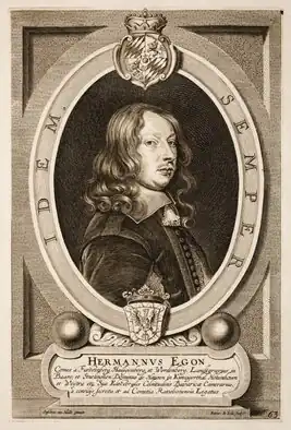 Herman Egon, Prince of Fürstenberg-Heiligenberg (5 November 1627 – 22 September 1674 in Munich) was Hofmeister, Chamberlain, Privy Councillor and Hofmarschall to Elector Ferdinand Maria of Bavaria. With his brothers Francis Egon and Wilhelm Egon, he played an important role in the imperial election of 1658 in Frankfurt. In 1664, Herman Egon and his brothers were elevated to Imperial Princes.