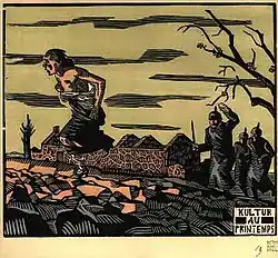 His first major series in wood was "The Four Seasons of Culture", a series of five woodcuts that depicted atrocities committed by the Germans in Belgium. The series is rich in texture and stunning in its detail. It depicts looting, burning and rape. It was met with immediate backlash from the political left.