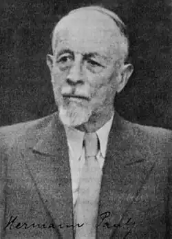 Pauly worked for a short period at Schering AG in Berlin, then became a research assistant to Hermann Emil Fischer at the Friedrich-Wilhelms-Universität. He then became a teaching assistant to Rudolf Nietzki at the University of Basel.[2] He returned to Bonn, where he qualified as a professor in 1901.[5] In 1904, he joined Albrecht Kossel at Heidelberg University.[2] Pauly studied for his habilitation at the University of Würzburg, and was appointed an assistant professor in 1909. In 1912 he joined a private laboratory. In 1918 he was appointed a full Professor at Würzburg.[2] Pauly became a member of the Corpsschleifenträger der Lusatia Leipzig in 1922.[6] Hermann Pauly was awarded an honorary doctorate in medicine in 1932. He died in Würzburg on 31 October 1950.[2]
