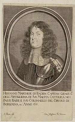 Margrave (Prince) Hermann of Baden-Baden (12 October 1628 in Baden-Baden; died 30 October 1691 in Regensburg) was a general and diplomat in the imperial service. He was Field Marshal, president of the Hofkriegsrat, and the representative of the Emperor in the Perpetual Diet of Regensburg.