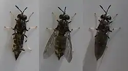 The adults of H. illucens measure about 16 millimetres (5⁄8 in) long.[14] These medium-sized flies have a predominantly black body, with metallic reflections ranging from blue to green on the thorax and sometimes with a reddish end of the abdomen. The second abdominal tergite has translucent areas, from which the Latin specific epithet derives. The head is wide, with very developed eyes. The antennae are about twice the length of the head. The legs are black with whitish tarsi. The wings are membranous; at rest, they are folded horizontally on the abdomen and overlapped.[15]