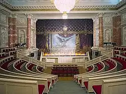 The semicircular auditorium is decorated with color marble and surrounded with ten niches for statues of Apollo and the muses. As the interior has never been overhauled, the original stage machinery remains in situ, but the elaborate sets, an acclaimed work of the Italian artist Pietro Gonzaga (1751-1831), were lost during the years of Soviet neglect.