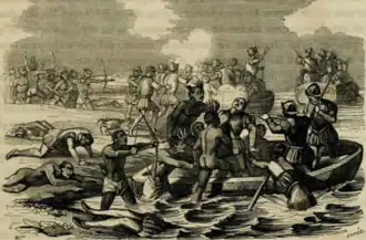 On land, the Spaniards, used to kindly receptions at Punta Mujeres, Cape Catoche, and Campeche, were now rather coldly received by armed locals who indicated their arrival was unwelcome.[31] Córdoba's men, 'stubborn' but in dire need of water, landed regardless and set to sating their thirst and filling their pipas at the riverbank.[31] Nightfall apparently crept up on the landed party, forcing the men to camp ashore for what must have been a tense night under the watchful eye of their aggrieved hosts.[32] The men next awakened at dawn to a growing audience of a great many locals dressed for battle, 'with cotton armour down to their knees, and bows and arrows, and spears and bucklers, and swords like two-handed montanes, and slingshots and stones, and plumes of the kind they usually don, and their faces masked in black and white.'[31] War drums now beat in their periphery, accompanied by a great roar, and an opening salvo of arrows and stones from all sides.[33] Frenzied combat ensued, reportedly amidst the local war captain's shouted orders of al calachoni, 'target the [Spanish] captain.'[33] Within 'little more than half an hour,' Córdoba, grievously injured, seeing nearly half his men fallen, a few captured, and little more than half alive but seriously injured, called for immediate retreat.[34] The survivors now rushed seawards to their brig and bateles, the locals in dogged pursuit even into sea.[35]