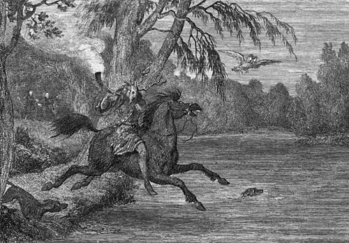 Further details have entered the folklore from even later sources and reported sightings, such as those in the 1920s.[3] William Harrison Ainsworth's 1843 novel Windsor Castle featured Herne and popularised his legend. Ainsworth's version of the tale added a number of new details, including having Herne being gored by a stag, only to have the Devil save him on the condition that he wear the stag's antlers. Jacob Grimm was the first to suggest, very influentially, that Herne had once been thought of as the leader of the Wild Hunt, based on his title.[1]