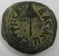 The most common prutah issued by Herod the Great is similar in design to that of the Hashmonean coinage, an anchor with Greek inscription "ΉΡωΔ ΒΆCΙ" (King Herod), and a caduceus between double cornucopiae,[2] which was meant as a continuation of the Hashmonean coinage as well as a continuation of the Hasmonean dynasty. However, Herod used only the Greek script on his coins, not the dual Greek and Hebrew method of the Hasmoneans.[3]