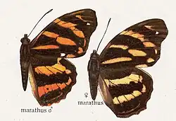 - H. m. marathus Doubleday Wingspan 70โ90 mm. Above bands tawny, very wide and confluent. It lives from Sikkim to eastwards.