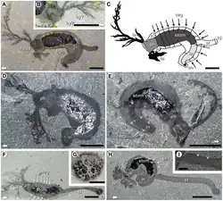 A mouth opened between the tentacles, leading internally to a pharynx, a large lentil-shaped stomach, a narrower straight intestine, and an anus at the end of the "tail." The tentacles were softer than the body and probably extensible. A dark line running down the center of each tentacle and connecting with the head is tentatively reconstructed as a hydrostatic canal and/or vascular system; if this interpretation is correct, the tentacles might have been controlled by fluid pressure, and individuals could have fed by snaring either small prey or edible particles in the tentacles and bringing the tentacles to the mouth, as in living sea cucumbers. Structures on the back of the head have been noted as potential pharyngeal pores, which suggests a relationship with early echinoderms. The whole animal was 3-4 cm long. They were probably gregarious, as up to eight individuals have been found on the same slab.[1] Six specimens of Herpetogaster are known from the Greater Phyllopod bed, where they comprise less than 0.01% of the community.[6]