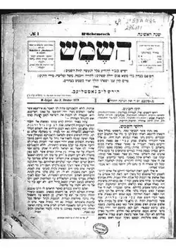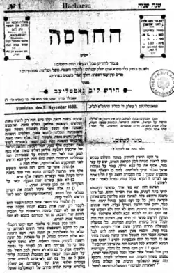 Under his own name, Gottlieb was also a famous translator, journalist and editor of newspapers in Sziget and Kolomyia (now in Ukraine). He founded what was effectively the first Hungarian weekly in Hebrew in 1878[3] in Sziget called "The Sun" (השמש).[4] As of 1887, after having been expelled by Rabbi Chananyah Yom Tov Lipa Teitelbaum of Sziget, he continued to publish it, in Kolomyia, alternating between the two names HaShemesh (השמש) and HaCharsah to avoid an Austrian tax on weekly newspapers.[5] He also published from 1893 to 1913 his "Jüdische Volkszeitung" (ייִדישע פאָלקסצײַטונג), Jewish People's Paper in Yiddish, from 1902 to 1914 his weeklies, Zion and Love of Zion (Ahavat Tzion אהבת ציון, together with Elijahu Blank) a bilingual Hungarian-Yiddish official Zionist newspaper,[6] as well as his monthly "Die Wahrheit" (The Truth) in Hebrew in 1896.[1] "Zion" is considered as the first Hungarian Zionist newspaper, which was sponsored by Theodor Herzl.[7]