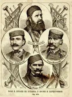 The Herzegovina uprising (Serbian: Херцеговачки устанак, romanizedHercegovački ustanak) was an uprising led by the Christian Serb population against the Ottoman Empire, firstly and predominantly in Herzegovina (hence its name), from where it spread into Bosnia and Raška. It broke out in the summer of 1875, and lasted in some regions up to the beginning of 1878. It was followed by the Bulgarian April Uprising of 1876, and coincided with Serbian-Turkish wars (1876–1878), all of those events being part of the Great Eastern Crisis (1875–1878).[1]