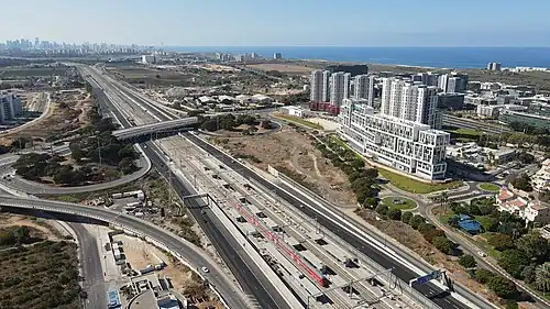 Herzliya railway station (Hebrew: תחנת הרכבת הרצליה, Taḥanat HaRakevet Herzliya) is an Israel Railways passenger station located in the city of Herzliya. The station currently has three island platforms serving two tracks each. In the 2010s, the Ayalon Highway was extended past the station northwards (as part of the Route 531 project) so that the platforms lie contained in the median of the highway, like the train stations in Tel Aviv.