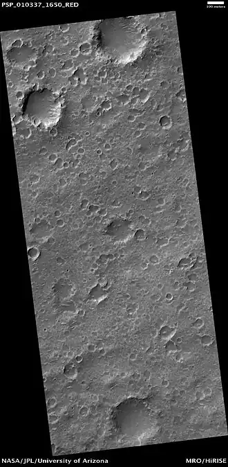 At large scales (>100 m or 330 ft), Hesperia Planum appears smooth and level,[16] having a relatively uniform surface elevation of 1.2 km (0.75 mi) above Mars datum.[17] The plain's surface is 200–800 m (660–2,620 ft) lower in elevation than the surrounding uplands of Tyrrhena Terra and Terra Cimmeria and is slightly tilted to the south, with a mean regional slope of about 0.03°.[14] In high-resolution images (<19 m or 62 ft/pixel), the surface of Hesperia Planum is dominated by dust and fine-grained deposits. Few boulders or bedrock outcrops are visible. Abundant, shallow craters filled with smooth, flat-lying deposits are common. No vents or volcanic constructs are identifiable, although small (<10s meters wide) channels are present.[18]