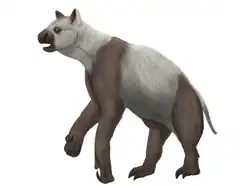 Hesperotherium would have coexisted with the proboscidean Sinomastodon, the giant ape Gigantopithecus, the pig Hippopotamodon, the mouse-deer Dorcabune, and the deer Cervavitus, as well as the pandas Ailuropoda wulingshanensis and Ailuropoda microta, the dhole Cuon antiquus, the tapir Tapirus sinensis and the proboscidean Stegodon.[2] Other classic animals typically include orangutans, macaques, rhinos, hedgehogs, hyenas, horses, the cow Leptobos, pikas, the extinct pigs Sus xiaozhu and S. peii, muntjac, Cervus (a deer), gaur (a cow), the goat-antelope Megalovis, and more rarely the large saber-toothed cat Megantereon.[3][2]
