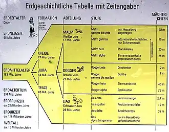 There is a geological nature trail on the mountain with signs that describe its origin. Each of the three main parts of the Jurassic era is divided into six sub-divisions, which are numbered with Greek letters alpha to zeta (Quenstedt's classification). The rocks that are found in the different layers are assigned to this classification.