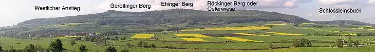 - The highly afforested eastern foothill, known for its legends, has the name Schlössleinsbuck. This small hill top is also called Small Hesselberg. The Röckinger mountain and the Schlössleinsbuck are separated by the Druid's valley.