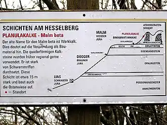 The topmost Jurassic layer is called the White Jurassic due to its light colour. These layers can be up to 400 m thick in the Franconian Jura, but at Hesselberg they are mostly ablated; only 85 m is left. The rocks of the Malm are partly sediments and partly formed from reefs of ancient sea sponges. This rock is widely distributed on the main peak. The light-coloured lime of the White Jurassic was a popular building material for houses (burnt lime) and for road construction (rubble). The depressions on the western plateau are caused by these excavations. The lowest layers form the Impressa-layers (low Malm alpha), which are approximately 25 m thick, and the Bimammatum-lime (high Malm alpha). The old name of the Planula-lime (Malm beta) is factory lime, which indicates the use as building material. This layer, which is 15 m thick and interspersed with sponge reefs, forms the plateau of the Osterwiese. The small quarry below the main peak consists of Planula-lime in its lower part, and the Ataxiocerate's layer (Malm gamma) in its upper, which builds up the main peak and is 20 m thick. The top layer of Malm gamma and the layers of Malm delta to Malm zeta have already been eroded away on Hesselberg.