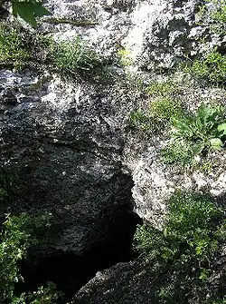 A long time ago some young lads herded sheep on Hesselberg. At that time there was a deep cave on the mountain, which is buried today. Bursting with curiosity they wanted to know what was inside. One of them was lowered by rope down into the deep hole. Beforehand the boys had decided to pull him up immediately when he gave a tug on the rope. Soon after the boy went into the cave, a three-legged rabbit hobbled across the way, the other lads followed it spontaneously in order to catch it, but the farther they chased the faster the rabbit ran. Finally they gave up. When they returned to the cave they remembered their fellow in the hole and they immediately pulled the rope up. It was stained with blood and at its end there hung a goat's hoof and a note with the mark 'Skrap' upon it, but the boy was gone forever.